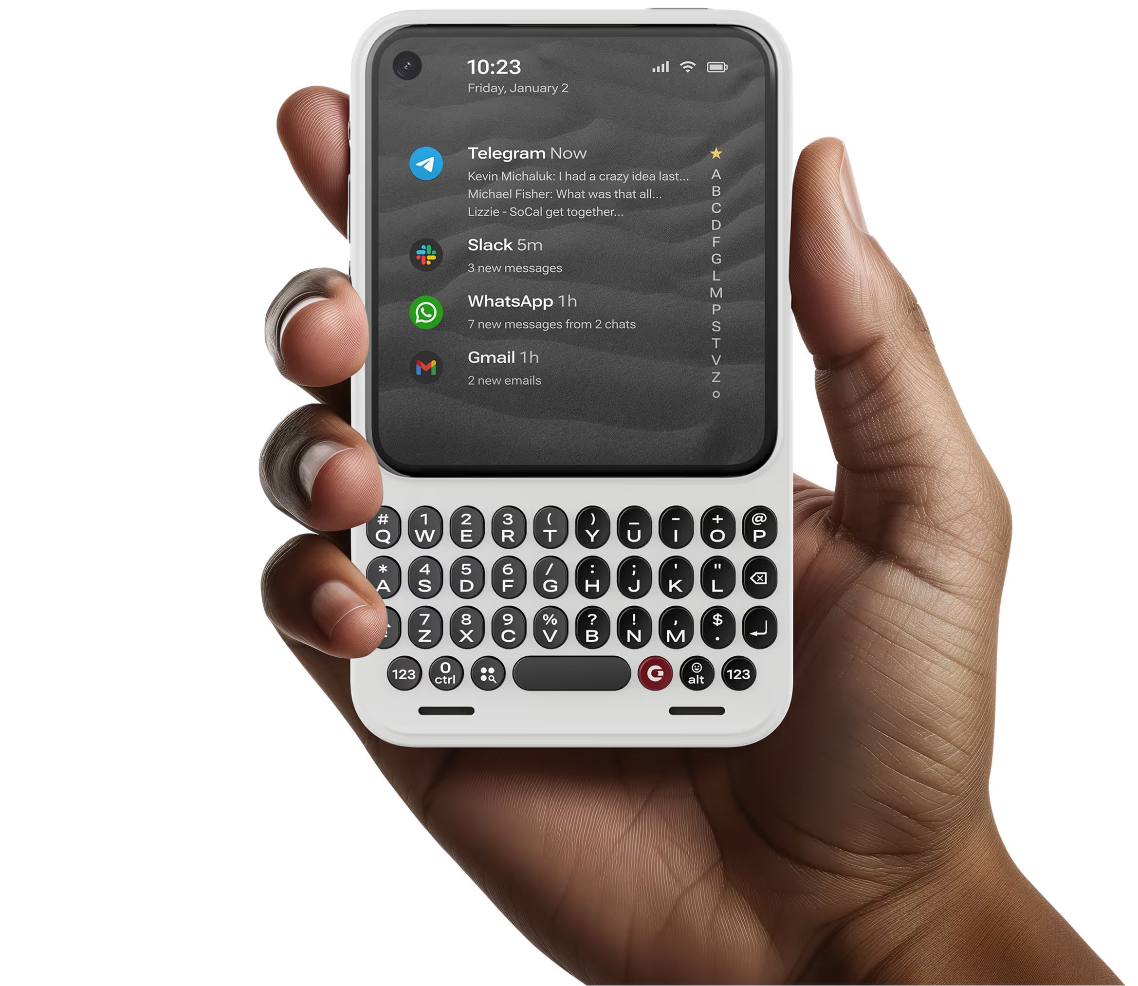 The Clicks Communicator looks very different from the glass slabs we carry today. It is small, with a 4 inch screen that is intentionally tiny. This makes it great for reading text but not very fun for watching long videos or scrolling through TikTok. The bottom of the phone features a real, physical keyboard with buttons that click when you press them. For many people, typing on real keys is much faster and more accurate than tapping on a piece of glass.