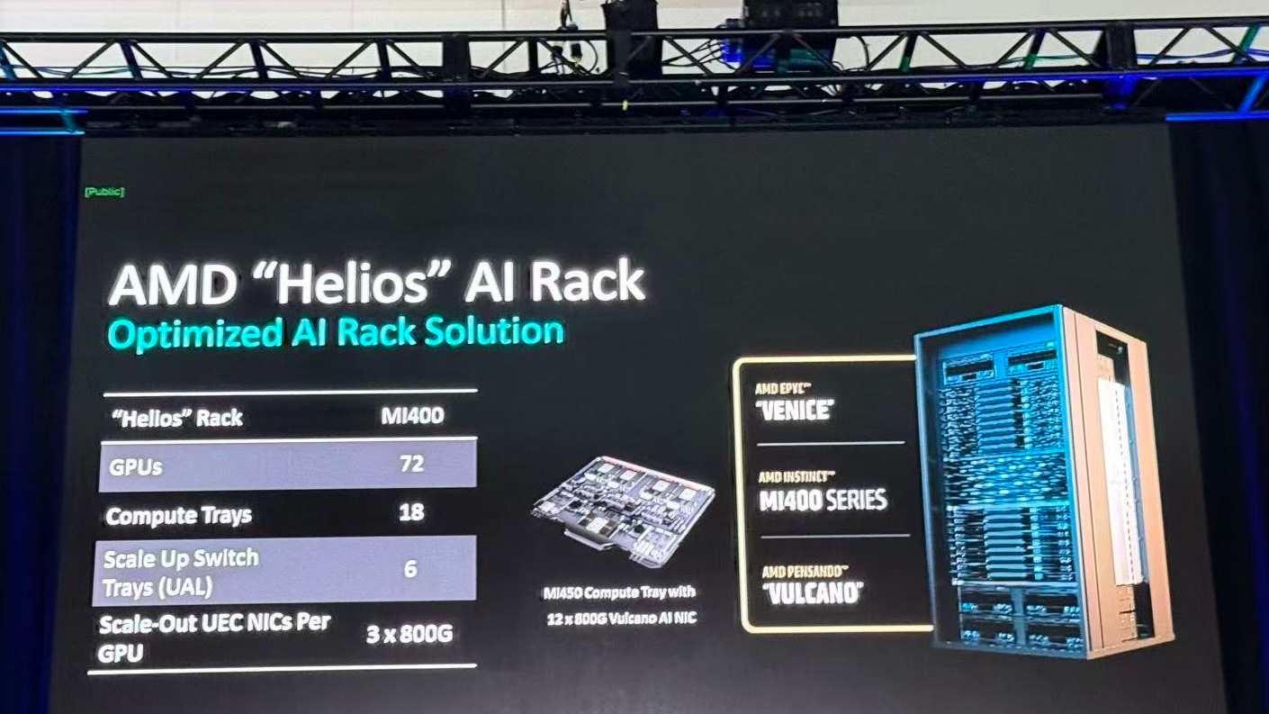A key feature of the design is the use of Ultra Accelerator Link over Ethernet. This serves as the high bandwidth interconnect between GPUs and forms part of a wider alignment with Ultra Ethernet Consortium standards. The approach contrasts with Nvidia’s NVLink centric systems and gives Helios a different method for scaling hardware across racks. The interconnect design is intended to support large GPU counts, although real performance depends on variables such as cooling, traffic patterns and software implementations.